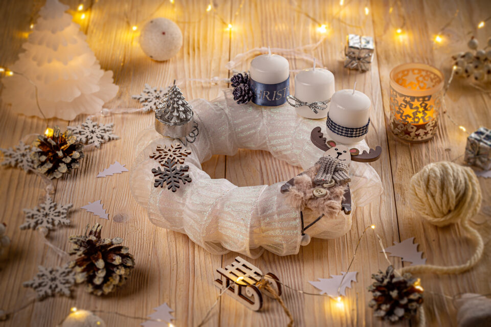 Nagyon látványos az olyan adventi koszorú is, amihez csak fehér színt és textileket, díszeket használunk fel. A szekrényben heverő, másra fel nem használható csipkék, kézimunkák, lágy fényű anyagok csak arra várnak, hogy beburkoljuk velük a koszorút, a maradékból pedig vékony drót segítségével kis angyalkákat formázzunk.