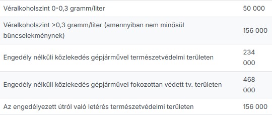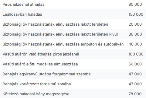 A Magyar Közlöny 2024. évi 79. számában hirdették ki az új, augusztus 16-tól érvényes büntetési tételeket, amelyek a következők (Ft):