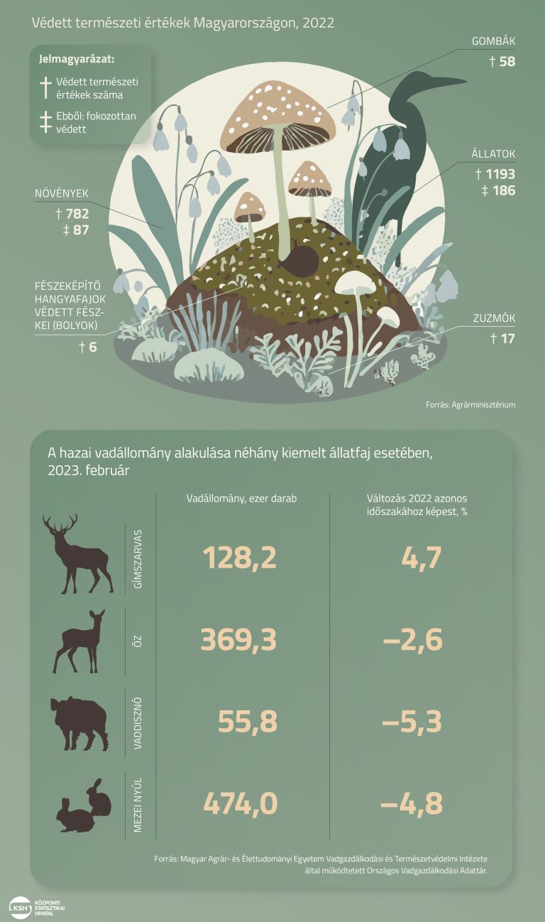 Magyarország területének 22 százaléka áll hazai vagy európai uniós jogszabályi védelem alatt. Védett természeti értékként 782 növény- és 1193 állatfajt tartottak nyilván a legutóbbi, 2022-es adatok alapján, ebből 273 faj volt fokozottan védett – derül ki a KSH jelentéséből.
