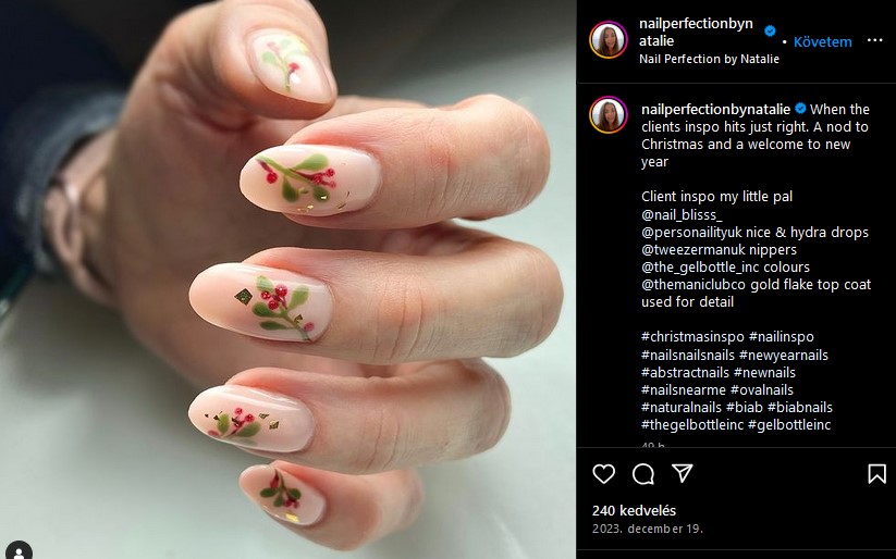 Az ünnepi körmök listája nem lenne teljes a karácsony klasszikus színeiben pompázó fagyöngy nélkül. A semleges alapszínnek köszönhetően a motívumot könnyedén kiemelhetjük, ráadásul ugyanolyan jól mutat rövid, mint hosszú körmön – megéri kipróbálni!