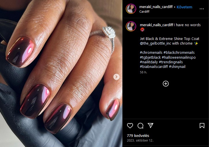 A krómhatású manikűr különlegessége abban rejlik, hogy olyan, mintha folyékony fémbe mártottuk volna a körmeinket. Fémes, holografikus csillogásának köszönhetően más és más színben pompázik, ha rávetül a fény – nem véletlenül rajong a trendért manapság Dua Lipa, Vanessa Hudgens és Zendaya is. Borvörös árnyalatokban bombabiztos választás lehet karácsonyra, szilveszterre egyaránt!