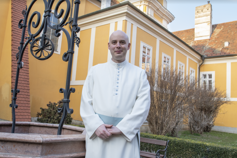 Mikor 2006-ban beléptem az apátságba, egy évig voltam itt Csornán, három idős atya, Ödön apát, Adorján atya, és Endre atya mellett. A fiatalabb atyák ezidőtájt növendékek voltak, Márton atya pedig Szombathelyen tanított hétközben. Hálás vagyok azért az évért, a szerzetesség első éve a tanulásról szól, Istenről és saját magunkról. Ezt követően ideiglenes fogadalmat tettem, és elkerültem Budapestre a Sapientia Szerzetesi Hittudományi Főiskolára. Teológiát végeztem, és tanári diplomát szereztem hittanár és etikatanár szakon. 2012-ben, mikor pappá szenteltek, visszatértem Csornára, ahol két évig káplán lettem a városban. Ezt követte a két éves római továbbképzés, melynek elvégzése végzettséget ad arra, hogy egyetemen, vagy főiskolán taníthatok teológiát. Márton atya azért küldött ki, ha valaki belép a szerzetesrendbe, legyen, aki az első 1-2 évben foglalkozik vele. Amit én tanultam, az az volt, hogy hogyan kell valakit elindítani a szerzetessé válás útján.