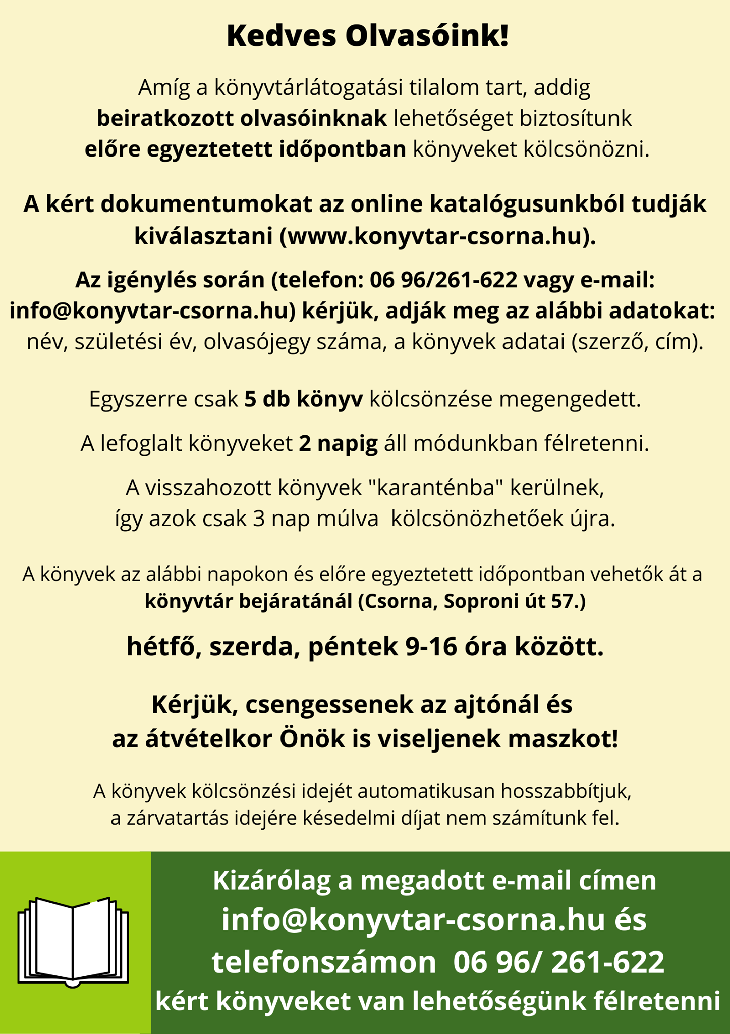 Amíg a vírushelyzet miatt a könyvtárlátogatási tilalom tart, addig a beiratkozott olvasóknak lehetőséget biztosítanak a kölcsönzésre Csornán.