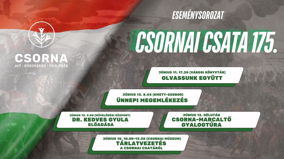 A csornai csata 175 évvel ezelőtt történt eseményeire több megemlékező eseménnyel készül a város önkormányzata. Június 11-én, kedden fél 6-kor a Városi Könyvtárban az „Olvassunk együtt” elnevezésű programmal indul a csornai csatához kötődő eseménysorozat.