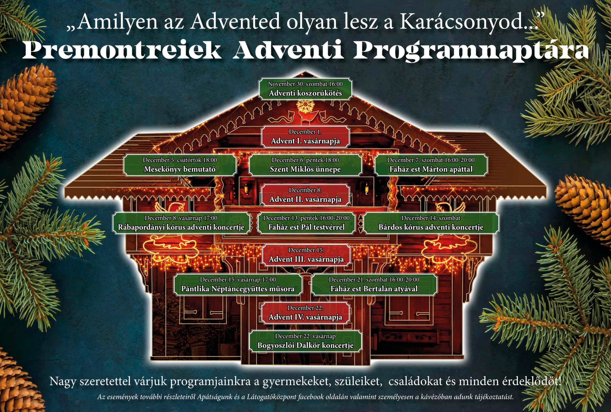 A programok sora november 30-án, szombaton 16:00 órakor adventi koszorúkötéssel kezdődik. Az advent minden vasárnapján gyertyagyújtásra kerül sor, de emellett különleges események is várhatók: