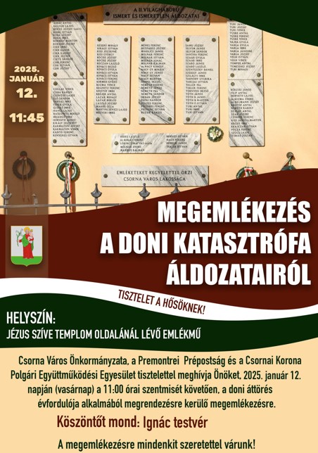 Január 12-én, vasárnap 11:45-kor a csornai Jézus Szíve Templom oldalánál lévő emlékműnél tartanak megemlékezést a Doni katasztrófa áldozatainak tiszteletére.