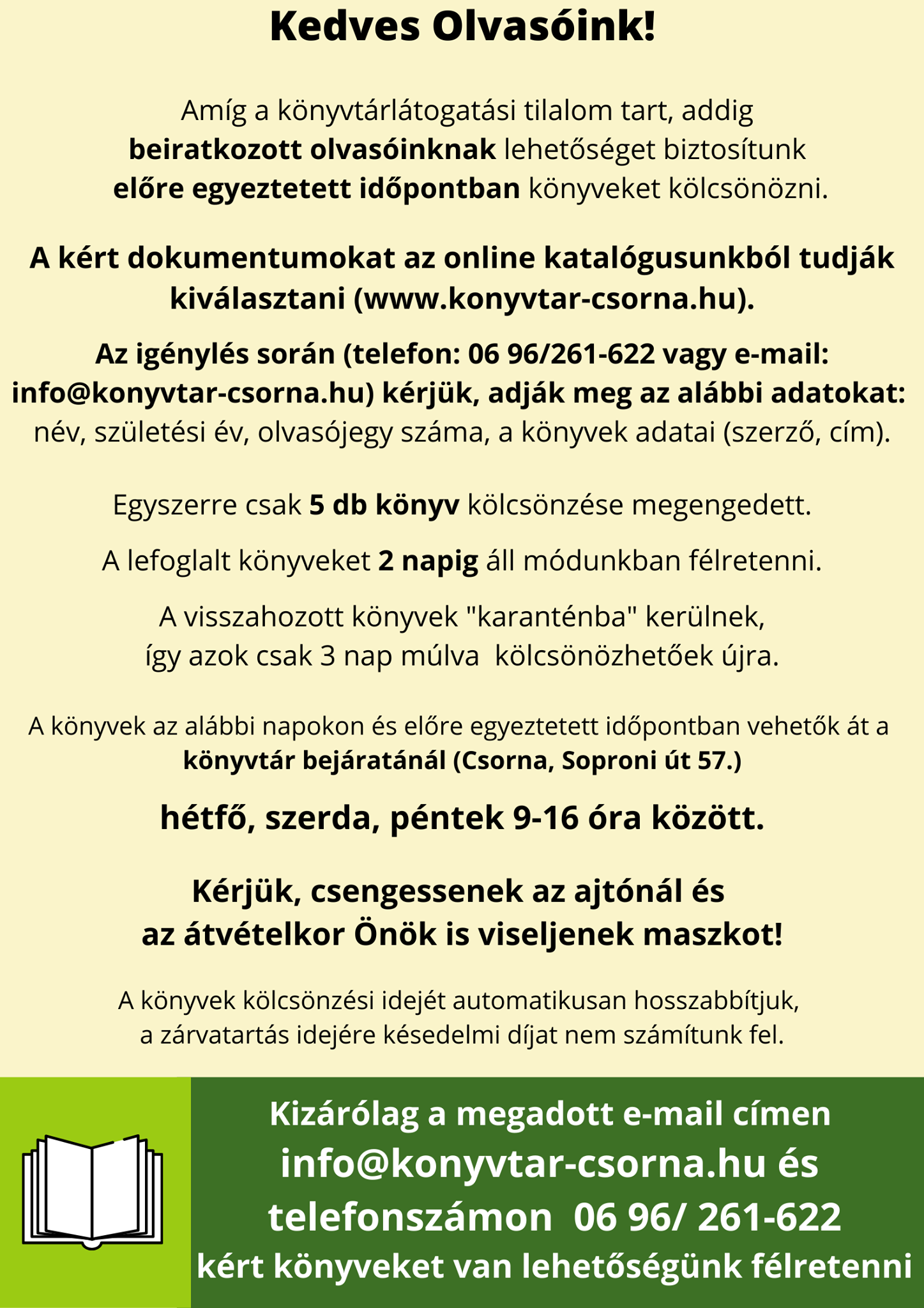 A Martincsevics Károly Városi Könyvtár várja olvasói kéréseit az e-mail címen, illetve telefonszámunkon: 06 96 261 622. A könyvek átvételére hétfőn, szerdán és pénteken 9-16 óráig van lehetőség.