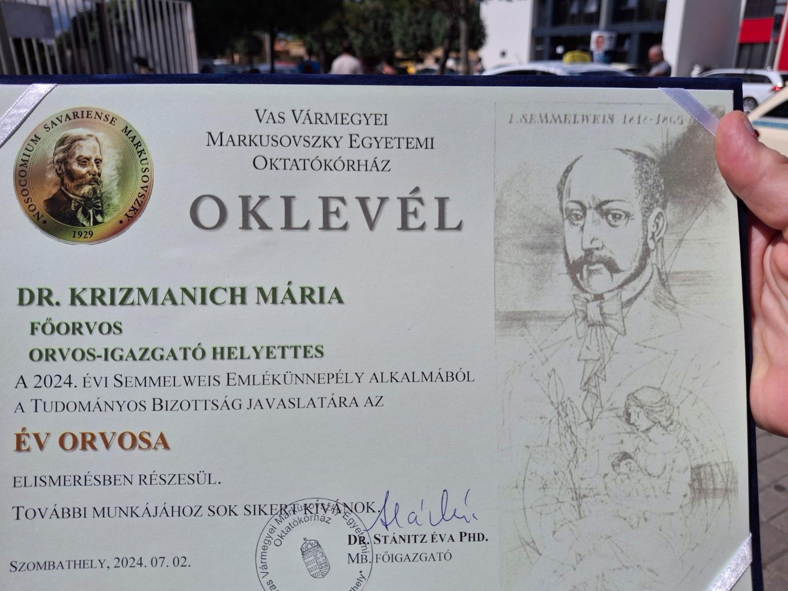 Az Év Orvosa címet idén Dr. Krizmanich Mária, a Celldömölki Krónikus Belgyógyászati Osztály orvosigazgató-helyettese vehette át, aki 2010-től erősíti a Markusovszky orvosi csapatát, 2023 decemberében nevezték ki orvosigazgató-helyettessé.