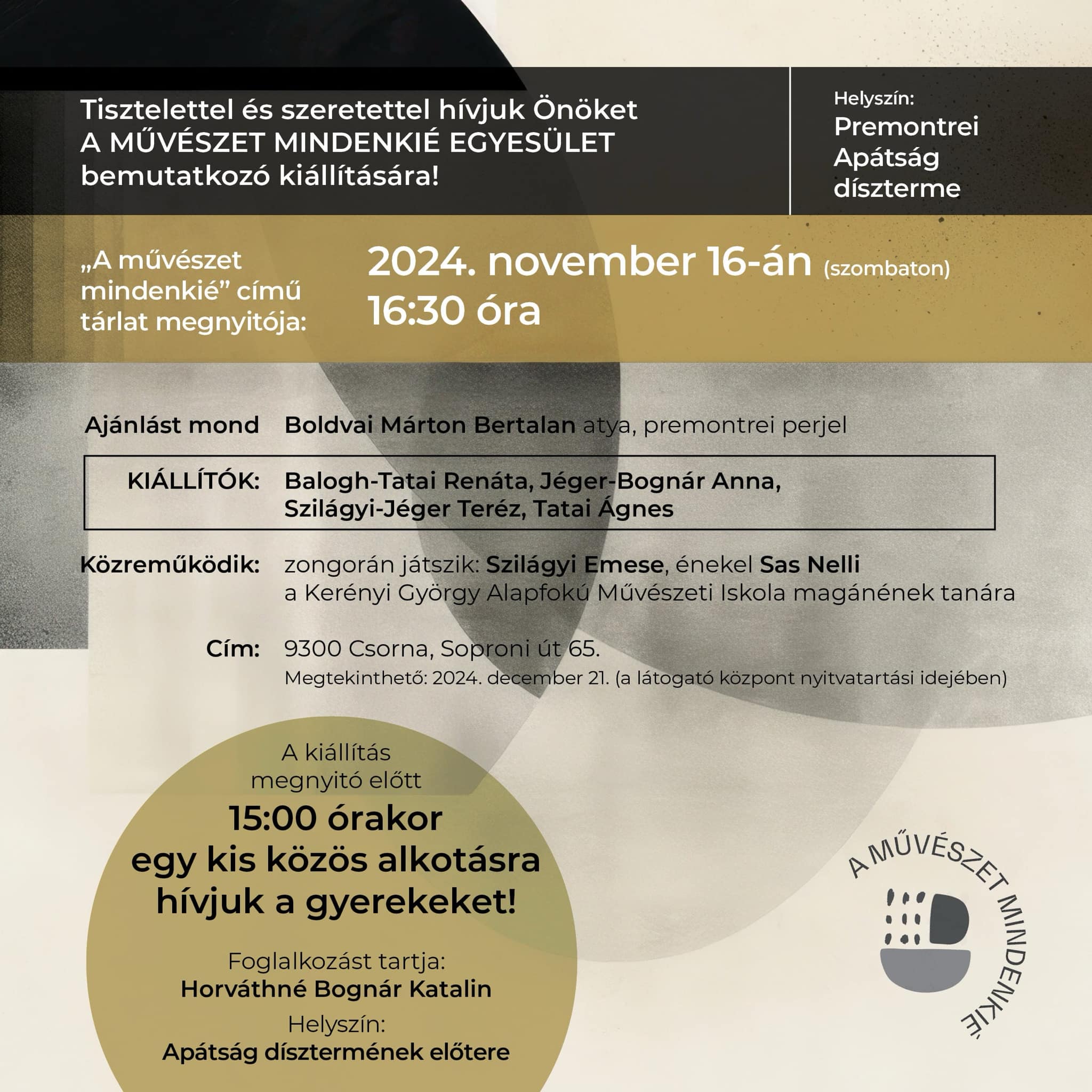 A Művészet Mindenkié Egyesület bemutatkozó kiállítására hívják az érdeklődőket, amely november 16-án, szombaton 16:30 órakor kerül megnyitásra Csornán, a Premontrei Apátság dísztermében.