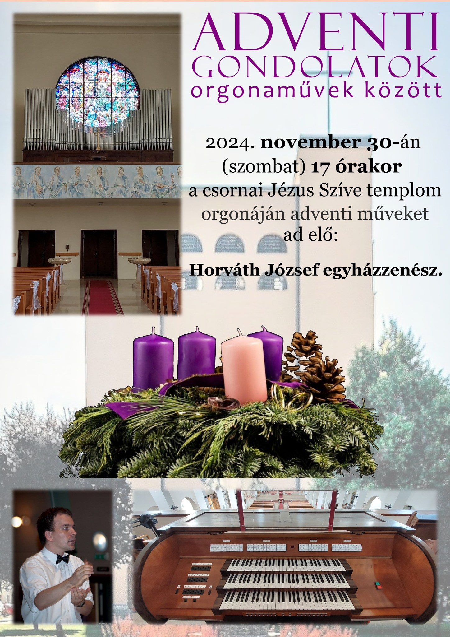 2024. november 30-án 17 órakor a csornai Jézus Szíve templom orgonáján adventi műveket ad elő Horváth József egyházzenész.