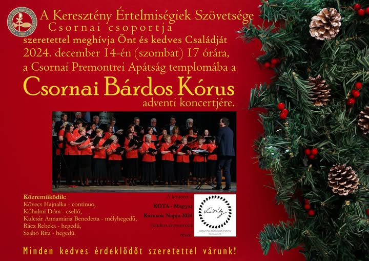 A Keresztény Értelmiségiek Szövetsége Csornai Csoportja szeretettel meghív minden érdeklődőt és családját egy különleges adventi koncertre. Az eseményre 2024. december 14-én (szombaton) 17 órakor kerül sor a Csornai Premontrei Apátság templomában.