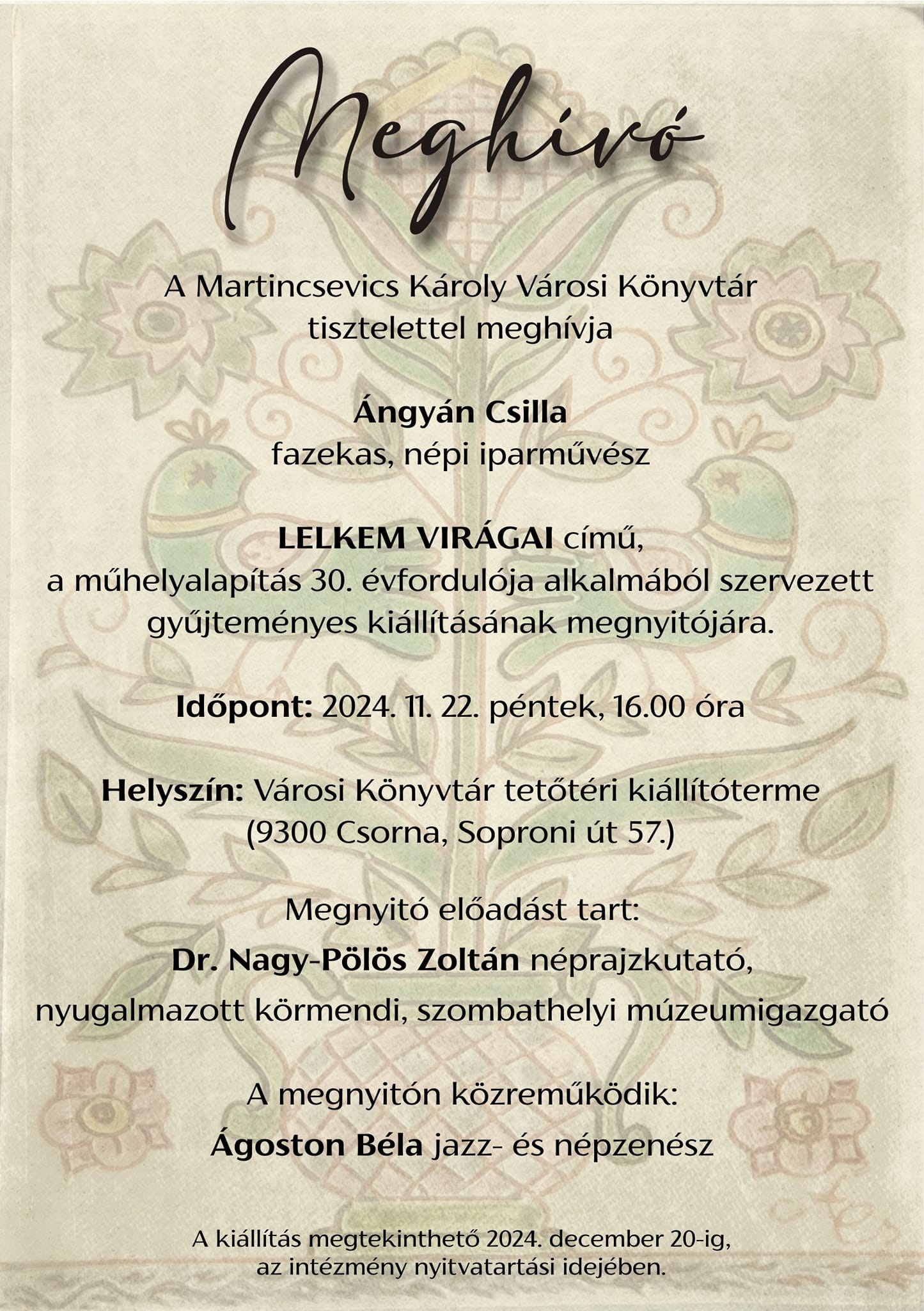A rendezvényt Dr. Nagy-Pölös Zoltán néprajzkutató, nyugalmazott múzeumigazgató nyitja meg, akinek előadása betekintést nyújt a népművészet világába. A megnyitón Ágoston Béla jazz- és népzenész is közreműködik, aki zenei produkciójával különleges atmoszférát teremt.