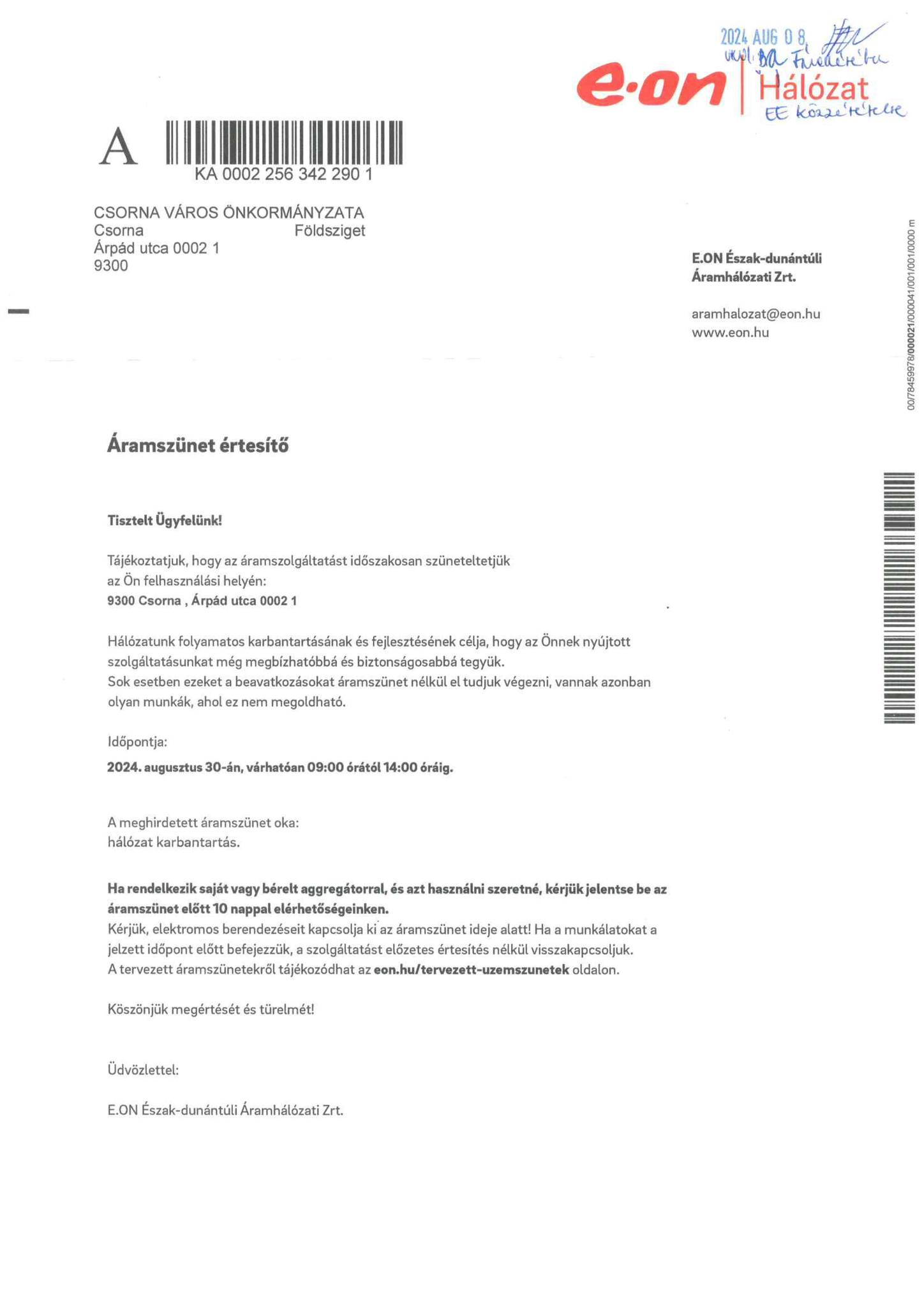 Hálózati karbantartás miatt Csornán, az Árpád utca 0002/1 szám alatti felhasználási helyen augusztus 30-án, várhatóan 9:00 és 14:00 óra között áramszünet lesz.