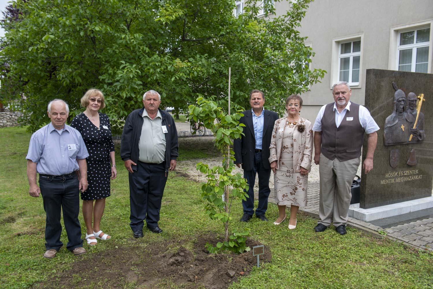 Az aranyutat járó egykori diákok az évfolyam-találkozón az iskola előtti parkban egy fát ültettek el közösen.