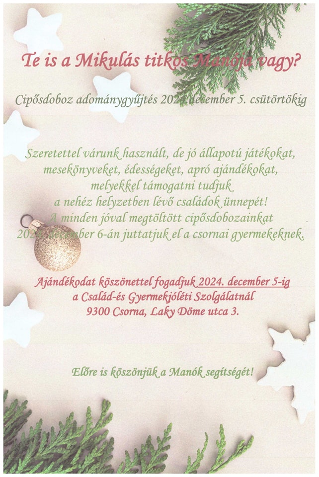 A szervezők szeretettel várnak minden jó állapotú játékot, mesekönyvet, édességet és apró ajándékot, amelyekkel a rászoruló családok ünnepét lehet szebbé tenni. A cipősdobozokat december 6-án juttatják el a csornai gyermekekhez. Az adománygyűjtés célja, hogy a nehezebb helyzetben lévő családok is érezhessék a karácsonyi szeretet és gondoskodás melegét.