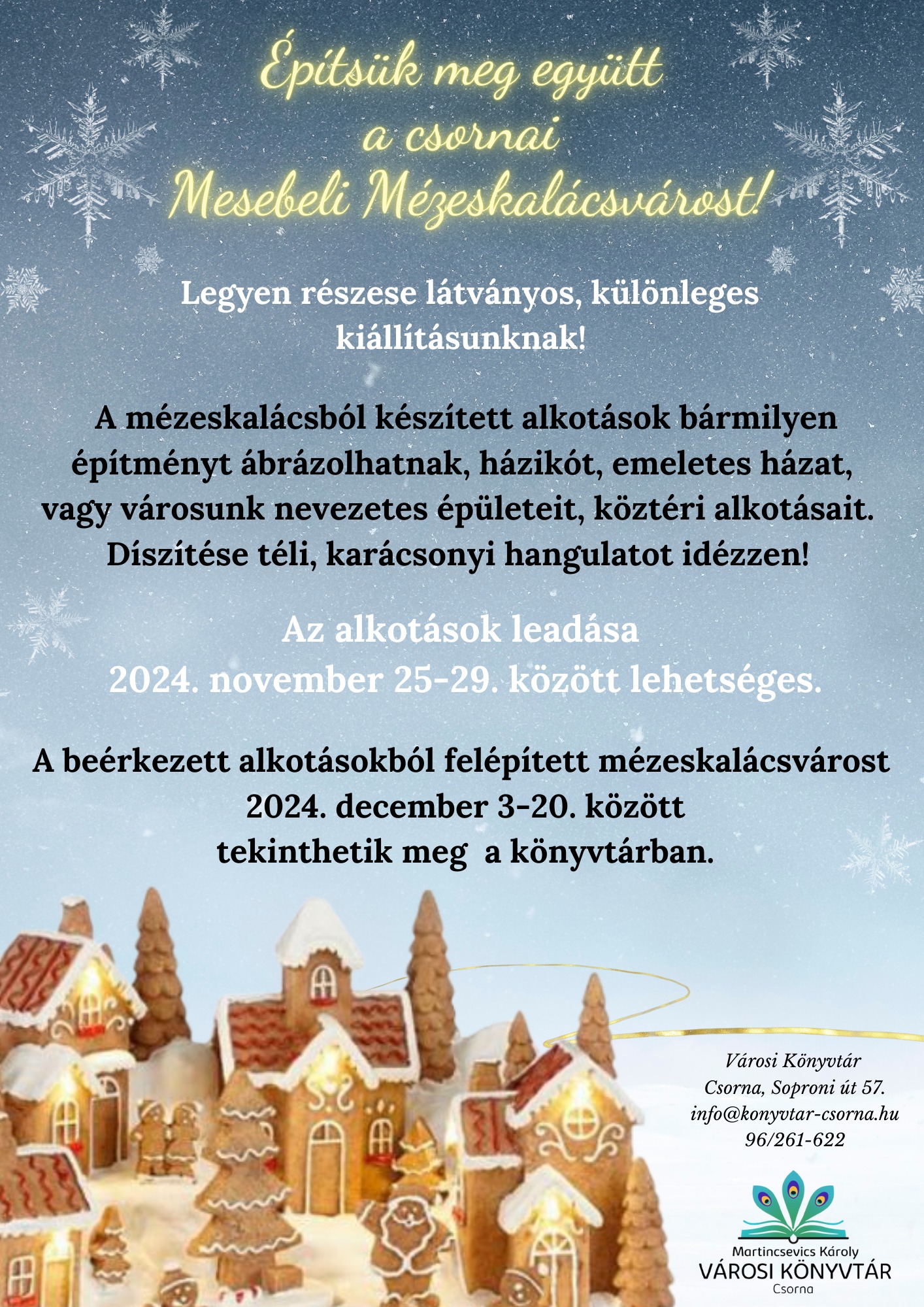 A csornai Városi Könyvtár idén is egy különleges látványosságra várja a kreatív alkotókat és az érdeklődő közönséget: a Mesebeli Mézeskalácsváros megépítésére!