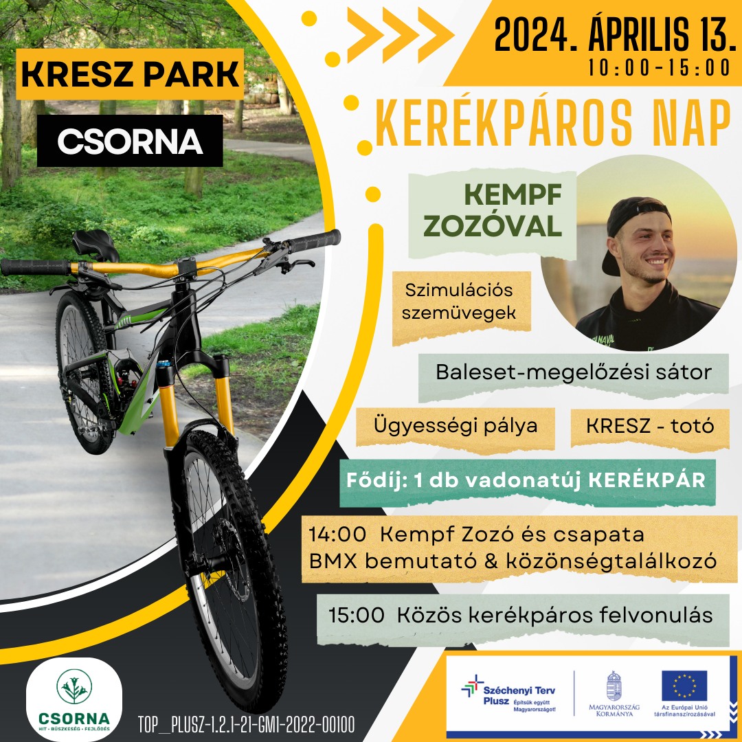 Számos program várja a résztvevőket, köztük szimulációs szemüveg használat, baleset-megelőzési sátor és KRESZ-totó. Délután kettőtől BMX bemutató lesz Kemph Zozóval és csapatával. Az esemény célja a kerékpározás népszerűsítése és a biztonságos közlekedés fontosságának hangsúlyozása.