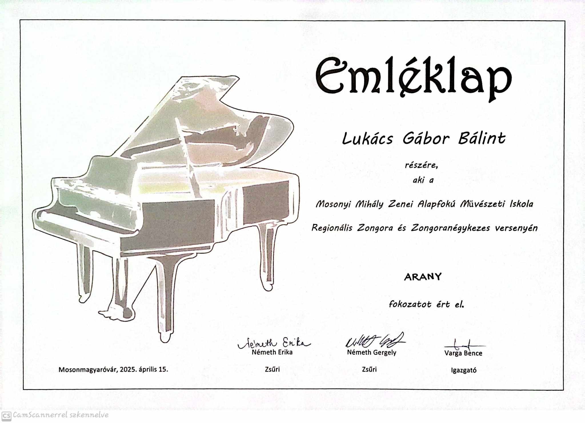 A Kerényi György Alapfokú Művészeti Iskola örömmel és büszkeséggel számol be arról, hogy növendékük, Lukács Gábor Bálint arany fokozatot ért el a Mosoni Mihály Zenei Alapfokú Művészeti Iskola által megrendezett Regionális Zongora és Zongoranégykezes Versenyen, melyre április 15-én került sor.