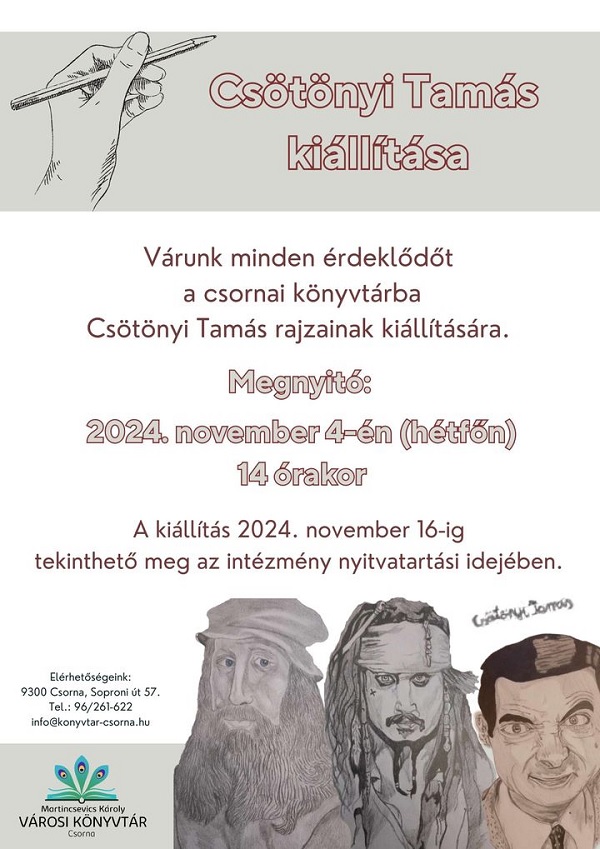 A csornai Martincsevics Károly Városi Könyvtár szeretettel vár minden érdeklődőt Csötönyi Tamás rajzainak kiállítására. A rendezvény megnyitója 2024. november 4-én, hétfőn, 14 órakor kerül megrendezésre.
