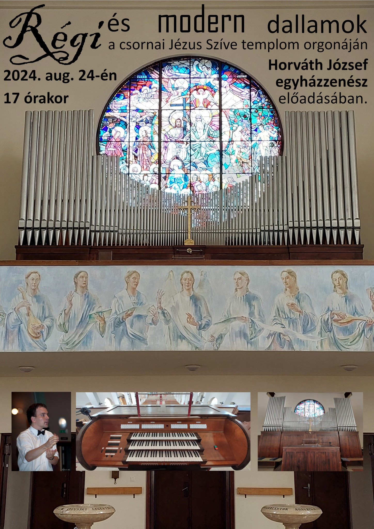 A csornai Jézus Szíve templom orgonáján régi és modern dallamok csendülnek fel Horváth József egyházzenész előadásában holnap délután 5 órakor.