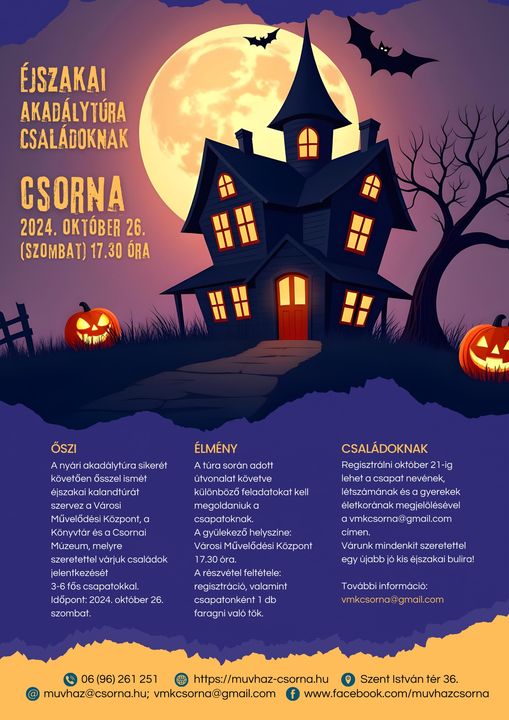 Az esemény keretében egy Éjszakai Akadálytúrára kerül sor, amely során a résztvevőknek egy adott útvonalon kell különböző feladatokat megoldaniuk. A találkozó 17:30-kor lesz a Csornai Művelődési Központnál, ahol a résztvevők csapatokban indulnak neki az akadályokkal teli kalandnak. Az eseményre október 21-ig lehet regisztrálni a megadott elérhetőségeken a címen lehet.