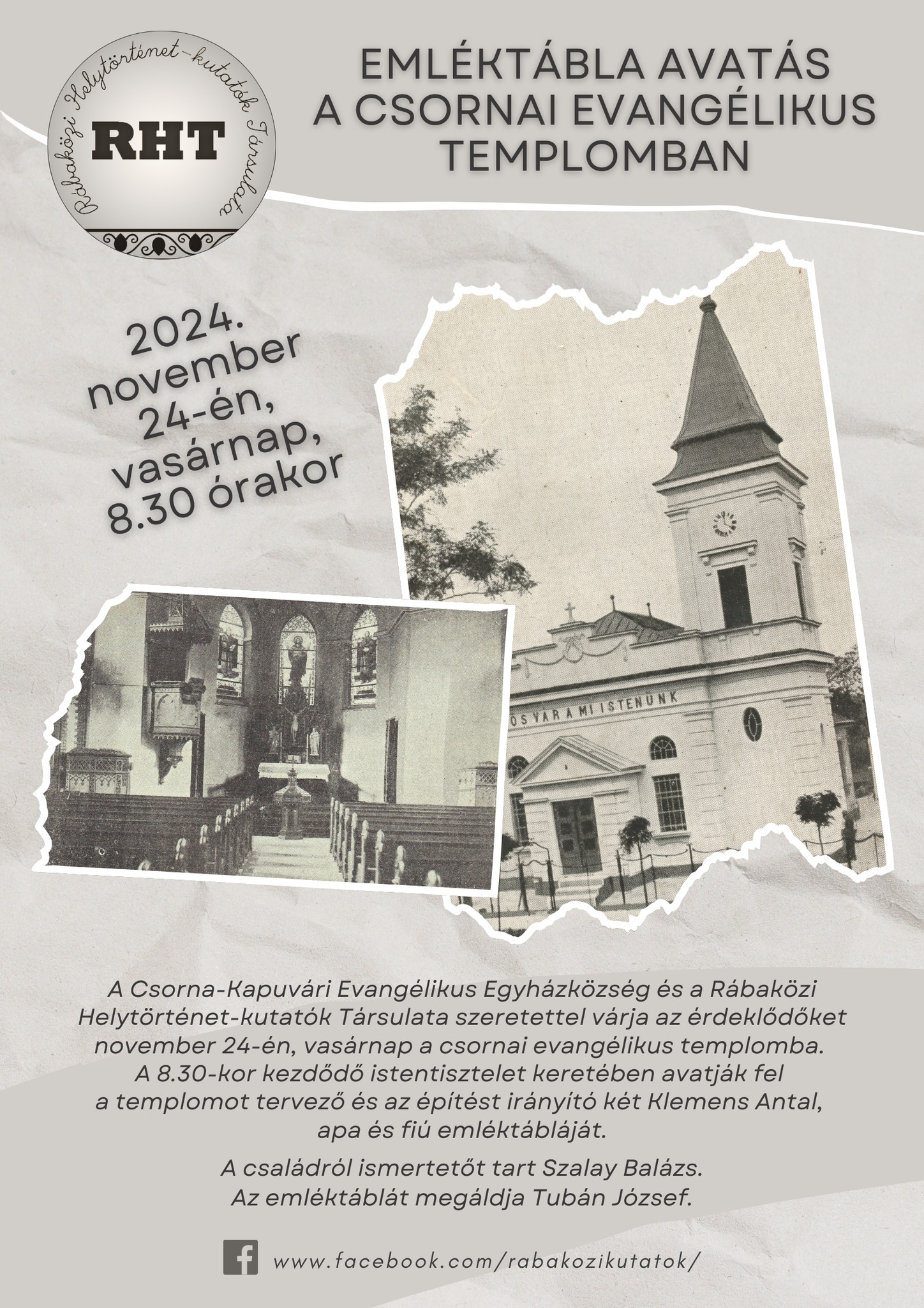 Ahogy korábbi cikkünkben már említettük, ezen a vasárnapon Csorna újabb emléktáblával gazdagodik. Az evangélikus templomban kerül sor a két építész, apa és fia, Klemens Antal és családja tiszteletére készült emlékmű felavatására.