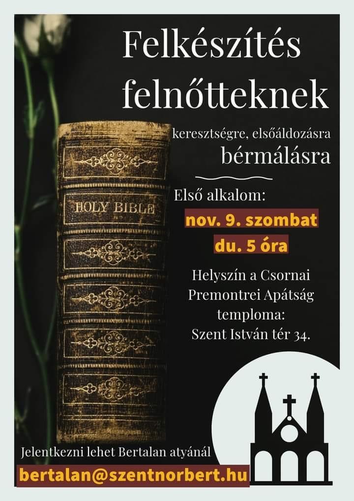 A Csornai Premontrei Apátság lehetőséget kínál felnőttek számára, akik szeretnék felvenni a keresztséget, elsőáldozást, vagy bérmálást. Az első alkalom 2024. november 9-én, szombaton 17 órakor kerül megrendezésre a templomban, amely Csornán, a Szent István tér 34. szám alatt található.