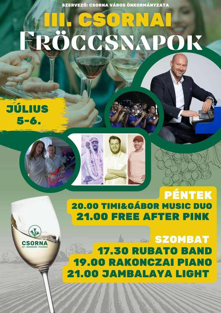 Idén is megrendezi Csorna önkormányzata immár harmadik alkalommal a Csornai Fröccsnapokat. Két napon át, július 5-6-án színes programokkal várják a látogatókat.