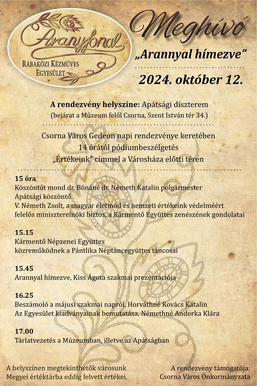 Az Aranyfonal Rábaközi Kézműves Egyesület szeretettel vár mindenkit október 12-én, szombaton, 15 órakor az Arannyal hímezve című rendezvényre, mely a Csornai Premontrei Apátság dísztermében (bejárat a Csornai Múzeum felől) kerül megrendezésre.