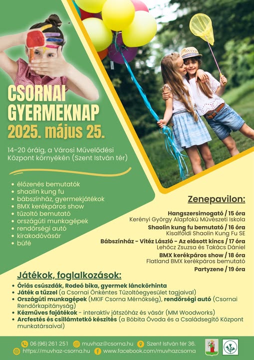 Színes programkavalkáddal várják a családokat Csorna város gyermeknapi rendezvényére, amely május 25-én 14 és 20 óra között kerül megrendezésre a Városi Művelődési Központ környékén, a Szent István téren.