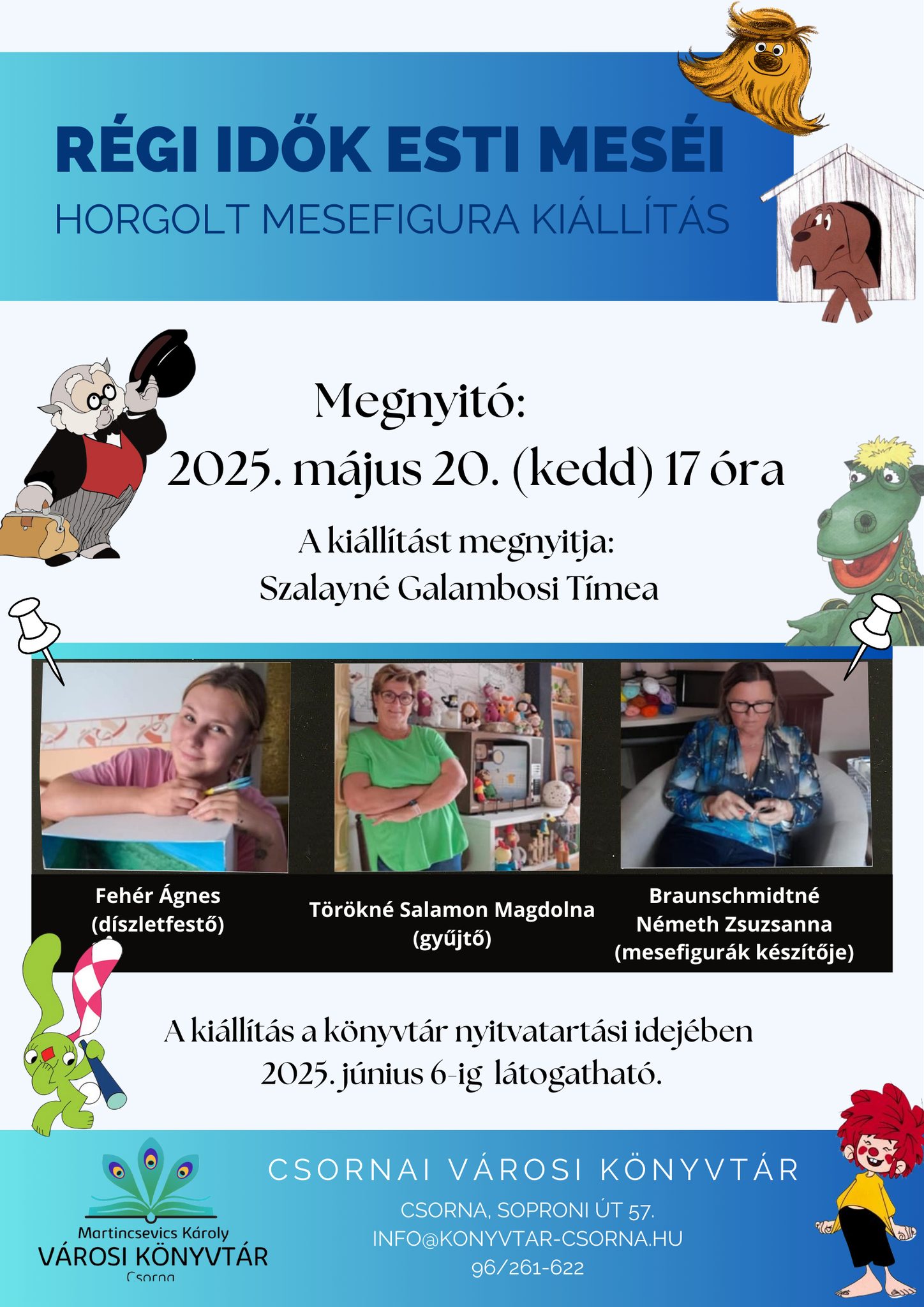A tárlatot Szalayné Galambosi Tímea nyitja meg, a kiállítás három lelkes alkotó – Fehér Ágnes (díszletfestő), Törőkné Salamon Magdolna (gyűjtő) és Braunschmidtné Németh Zsuzsanna (figurakészítő) – munkáját mutatja be. A látogatók klasszikus mesehősök horgolt másaival találkozhatnak, melyek nemcsak a gyerekek, hanem a felnőttek szívét is megdobogtatják.