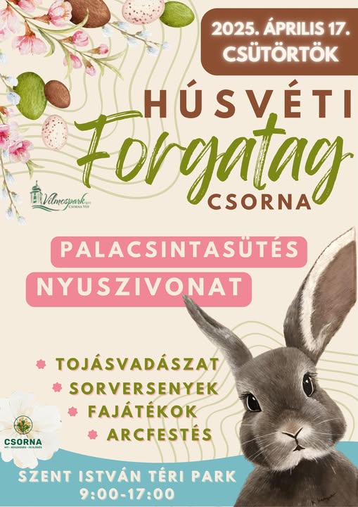 Április 17-én, csütörtökön egész napos családi programkavalkádra invitálják a csornaiakat és a környékbelieket a Szent István téri parkba, ahol reggel 9 órától egészen 17 óráig tart a Húsvéti Forgatag.