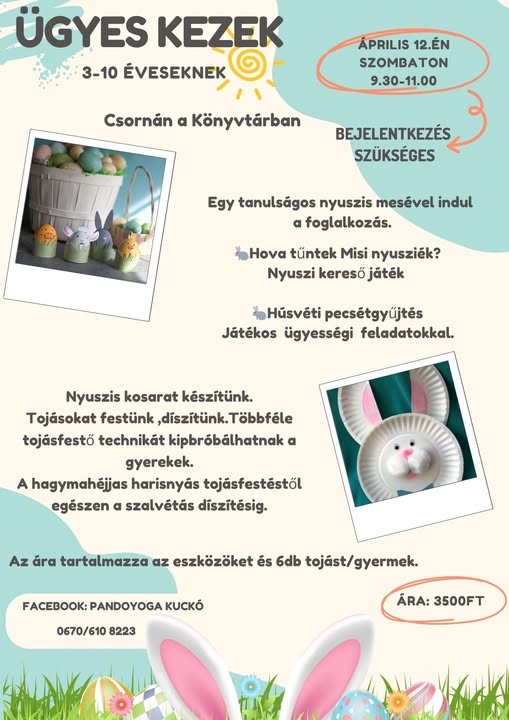 Április 12-én, szombaton egy különleges húsvéti kézműves foglalkozás várja a 3–10 éves gyerekeket Csornán, a könyvtárban.