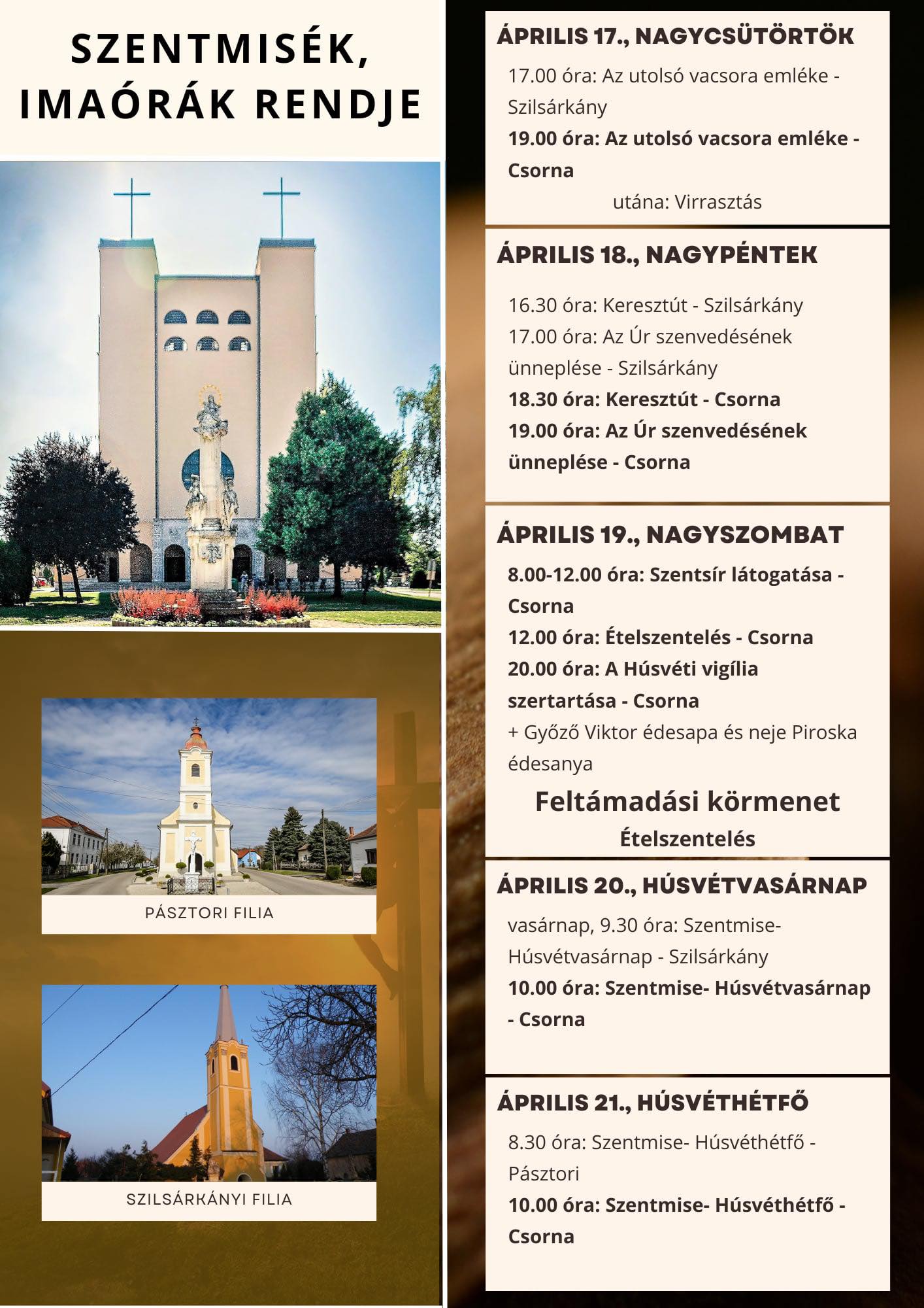 A csornai Jézus Szíve Templom és filiái szeretettel hívnak mindenkit az ünnepi szertartásokra. A húsvéti időszak nem csupán emlékezés, hanem lehetőség arra is, hogy lelkileg megújulva, a hit és remény erejével lépjünk tovább a mindennapokban. Legyen ez az ünnep valódi találkozás a Feltámadottal – önmagunkban, egymásban és a közösség erejében.
