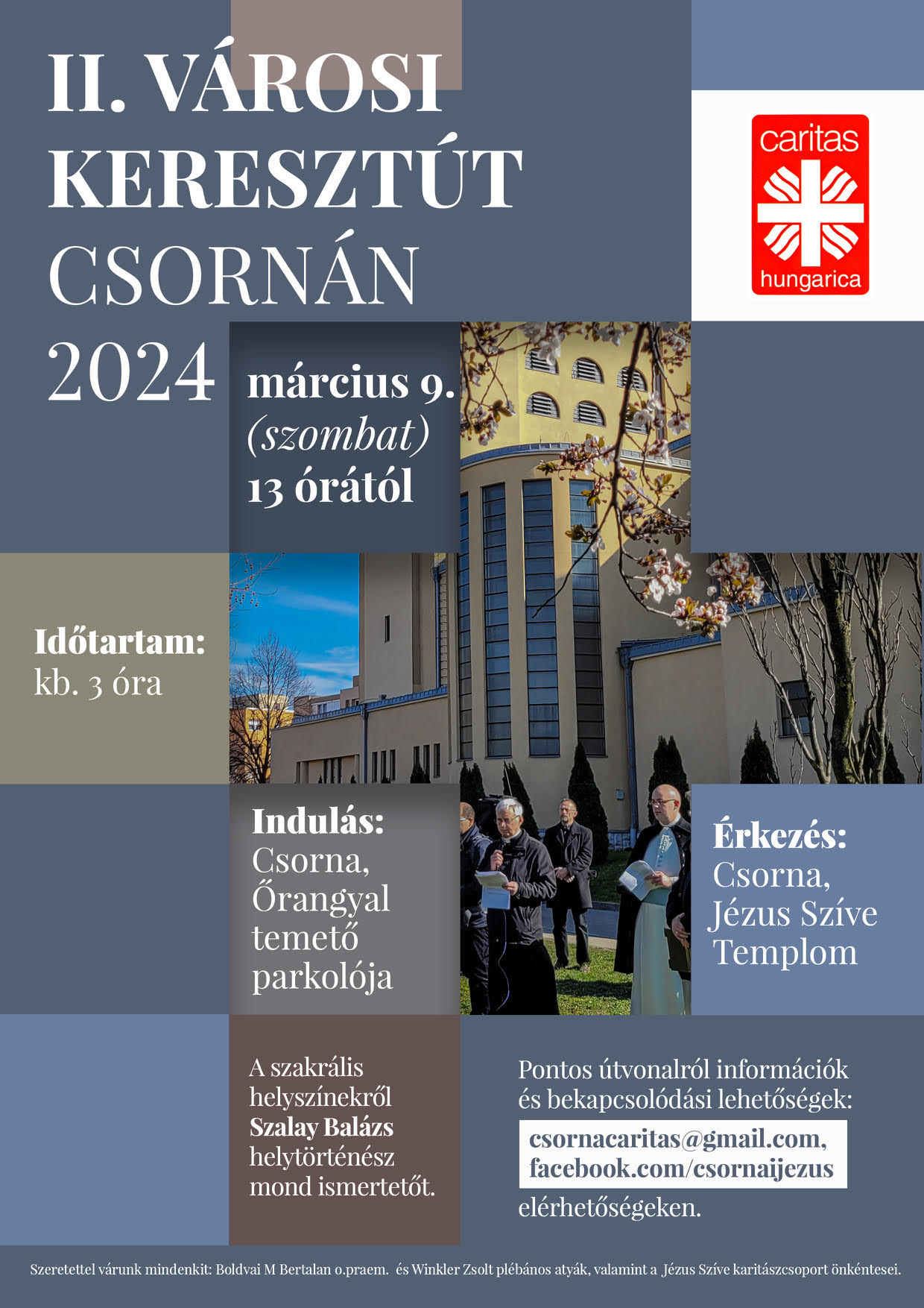 Megszervezik a II. Városi Keresztutat Csornán a Jézus Szíve karitász-csoport önkéntesei Boldvai Márton Bertalan, O.Praem és Winkler Zsolt plébános közreműködésével március 9-én, szombaton délután 1 órától.