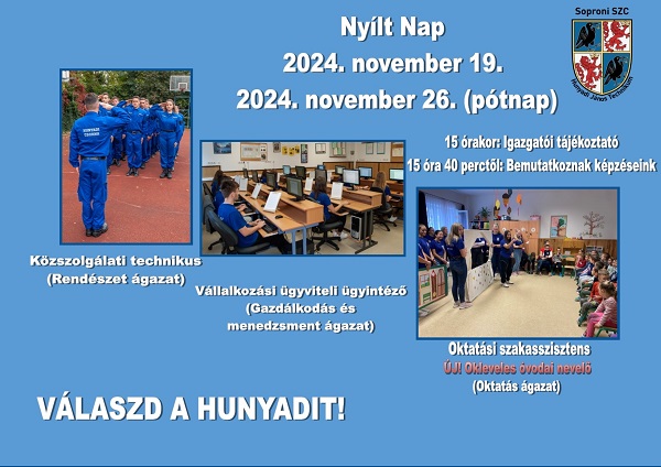 A Soproni SZC Hunyadi János Technikum november 19-én, illetve pótalkalommal november 26-án rendezi meg nyílt napjait. A rendezvény során az érdeklődők betekintést nyerhetnek három különböző szakterület képzéseibe: