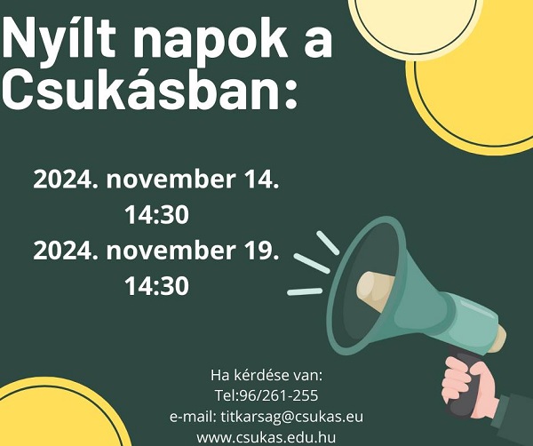 A Csukás Zoltán Mezőgazdasági Technikum két időpontban, november 14-én és november 19-én, 14:30-kor várja az érdeklődőket. A Csukás nyílt napjai elsősorban a mezőgazdaság és kapcsolódó területek iránt érdeklődő diákok számára kínálnak átfogó képet az iskolában elérhető szakmai programokról és lehetőségekről.