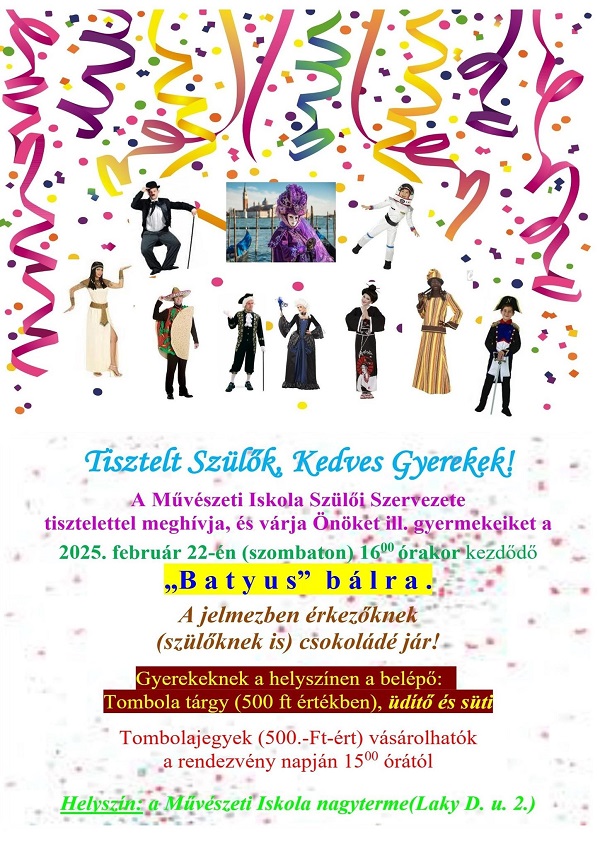 A Kerényi György Alapfokú Művészeti Iskola Szülői Szervezete nagy örömmel hívja és várja a gyermekeket és szüleiket a február 22-én, szombaton 16 órakor kezdődő "Batyus" bálra.