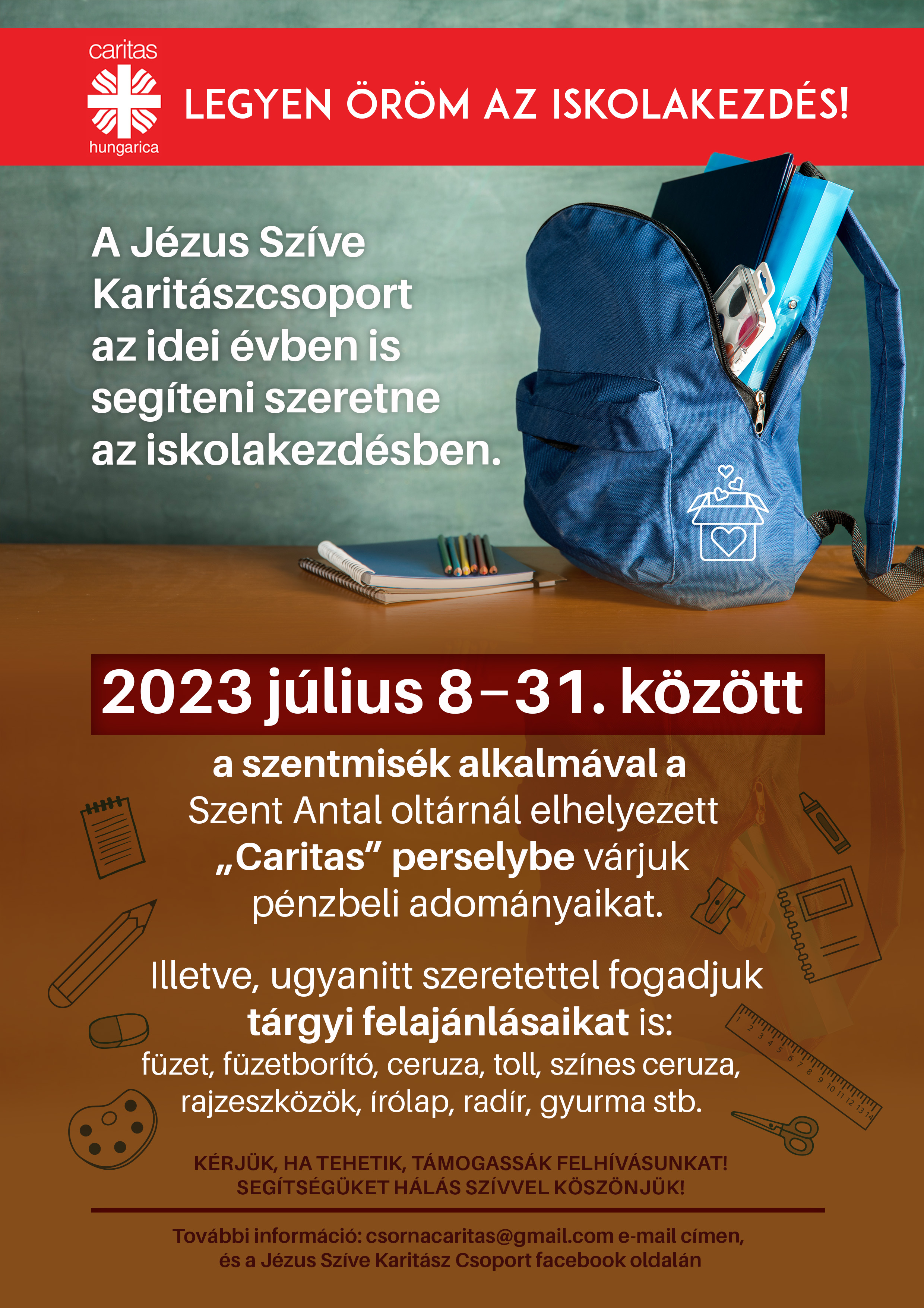 A csornai Jézus Szíve Karitászcsoport idén is segíteni kívánja az iskolakezdésre készülő gyermekeket és családjaikat. 2023. július 8-31. között a szentmisék alkalmával a Szent Antal oltárnál elhelyezett "Caritas" perselyben pénzbeli adományokat várnak, hogy minél több gyermeknek nyújthassanak támogatást az iskolai felszerelés beszerzéséhez.