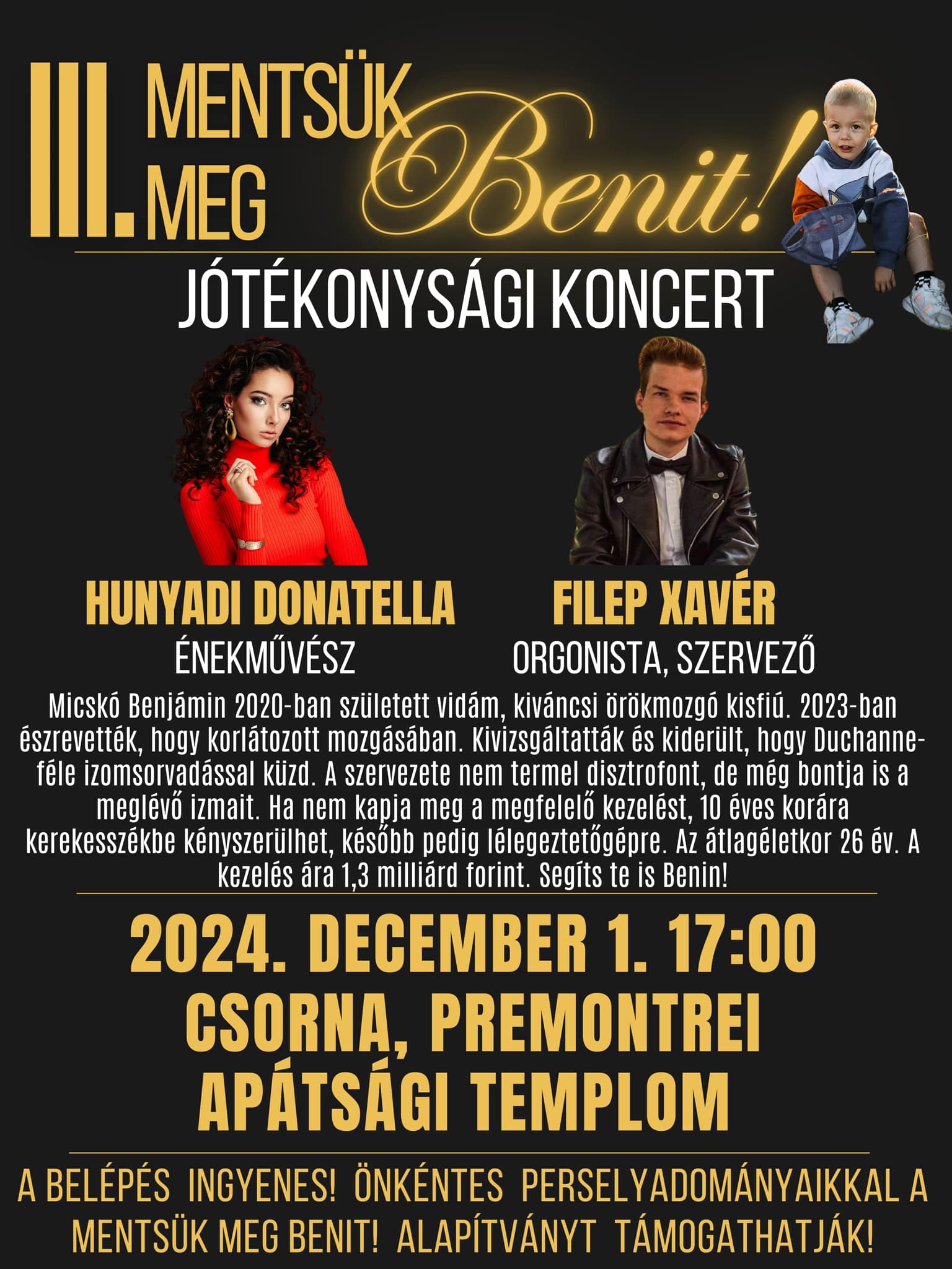A Mentsük meg Benit! jótékonysági koncertre december 1-jén, vasárnap 17:00 órakor kerül sor a csornai Premontrei Apátsági Templomban.