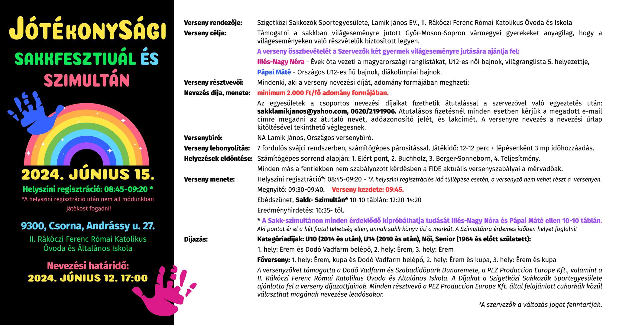Jótékonysági sakkfesztivált és szimultánt rendeznek Csornán, melynek célja, hogy anyagilag támogassák a Győr-Moson-Sopron vármegyei gyerekeket, akik világeseményeken képviselik hazánkat.