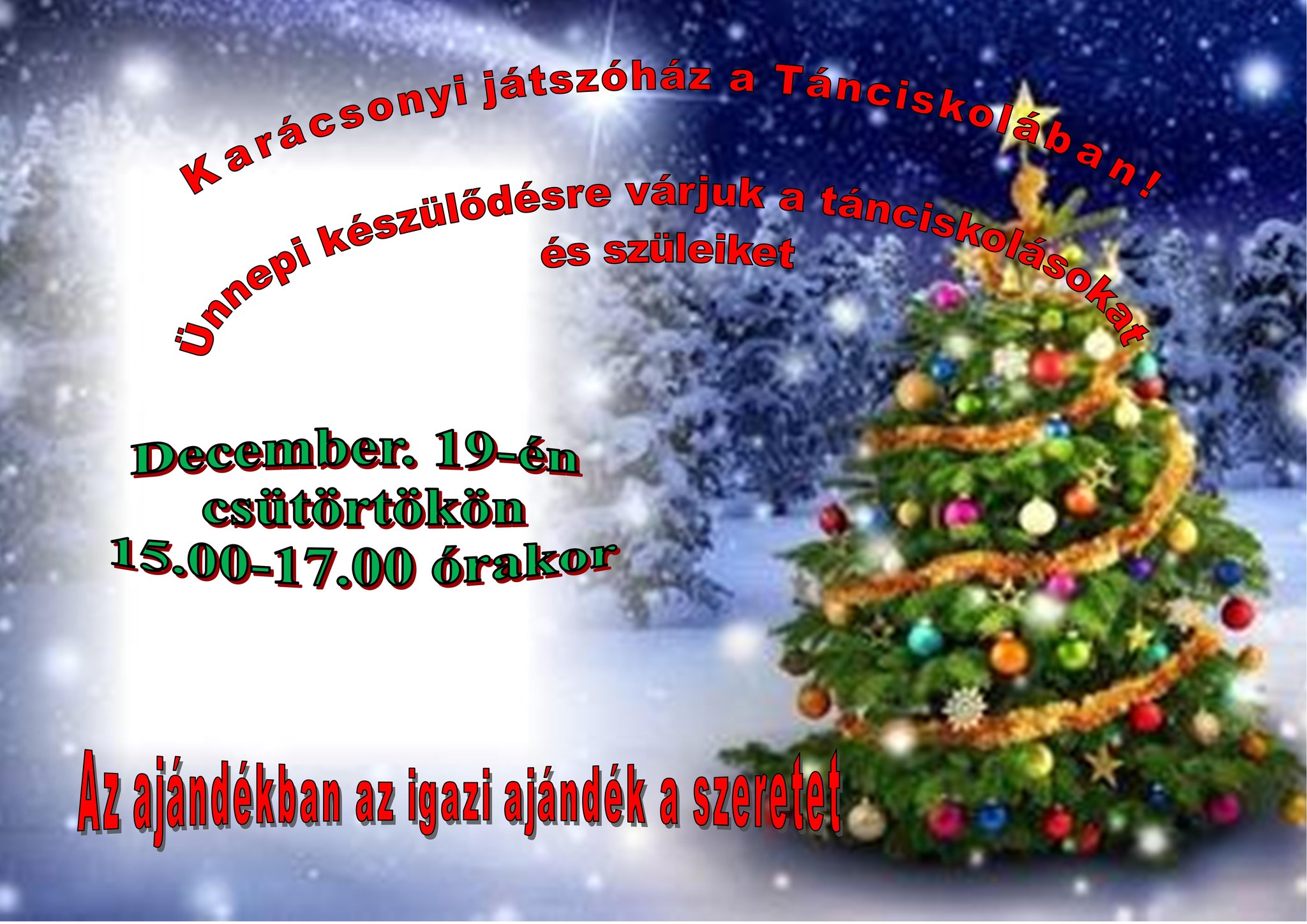 Idén december 19-én, csütörtökön 15:00 és 17:00 óra között különleges ünnepi hangulat költözik a csornai Tánciskolában.