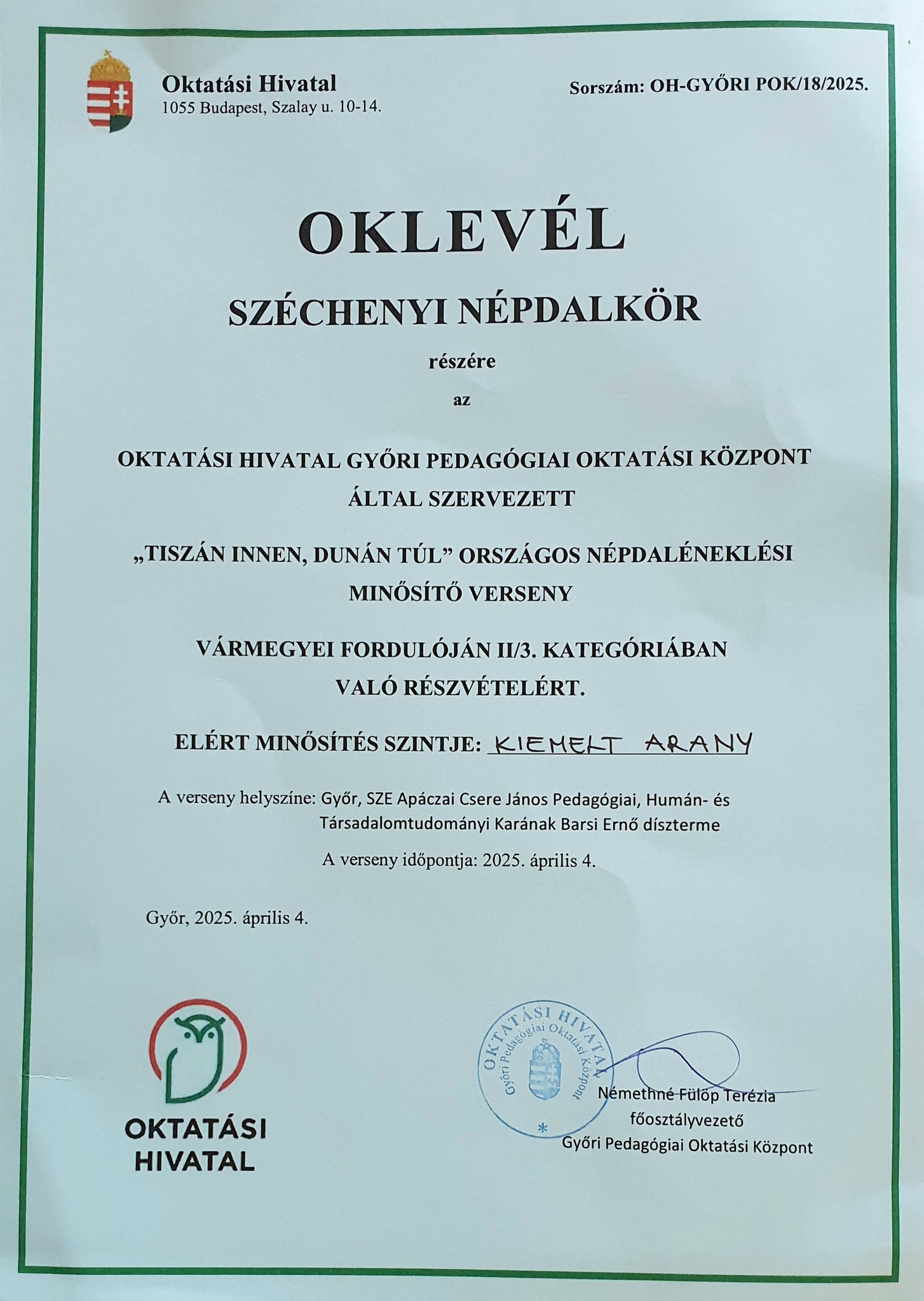 A kiemelt arany minősítés egyben belépőt is jelent az országos döntőbe, ahol a csoport a legjobb hazai népdalkörökkel mérettetheti meg magát. A következő fordulóban már nemcsak a megyét, hanem a régió népzenei örökségét is képviselik, méltóképpen továbbvíve a Széchenyi Istvánról elnevezett intézmény szellemiségét.