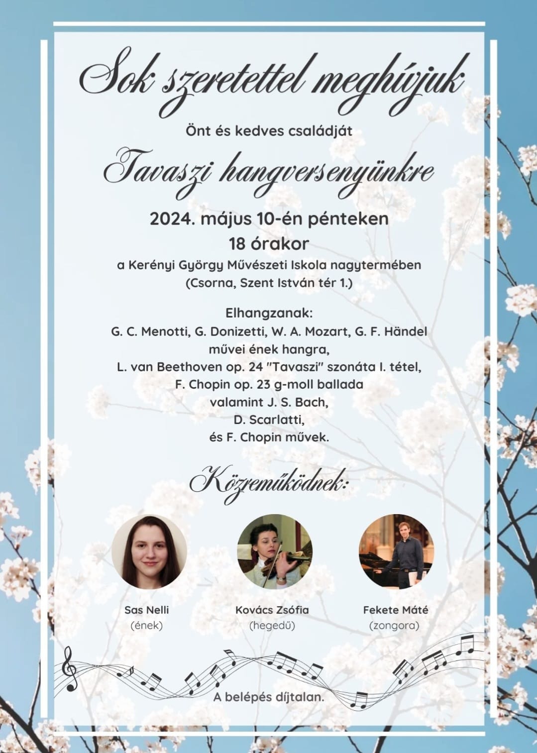 A hangversenyen, melyre a belépés díjtalan, énekel Sas Nelli, közreműködik hegedűn Kovács Zsófia, zongorán Fekete Máté.