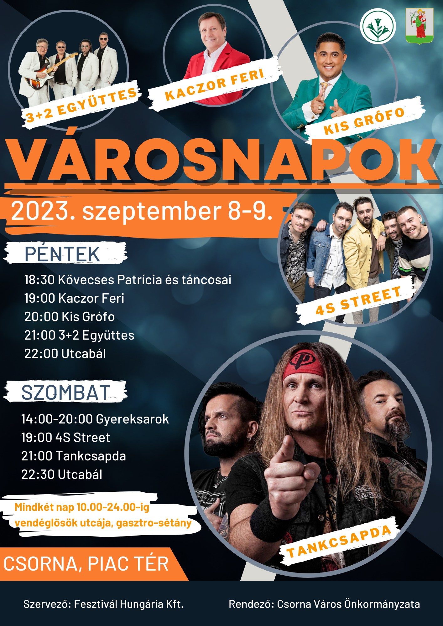 A Csornai Városnapokat 2015. óta minden évben nagy várakozás fogadja. Az évek során ez a városi rendezvény két napossá nőtte ki magát, helyet adva Magyarország számos, nagynevű zenekarainak. Idén a pénteki napon a mulatós zenéjé a főszerep, szombaton pedig jönnek a Tankok.