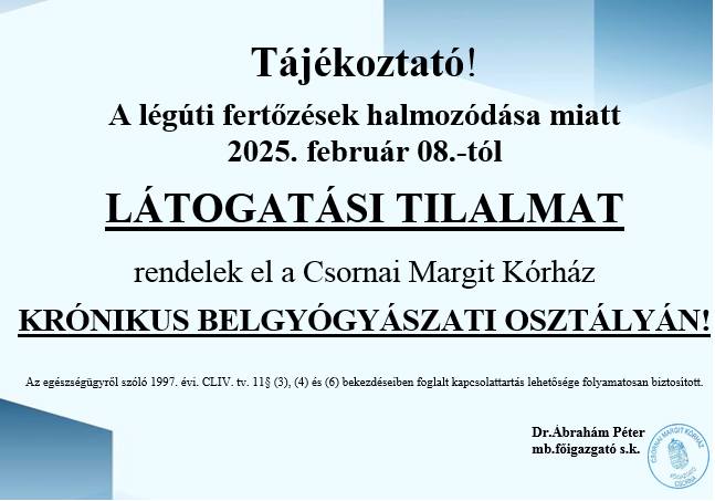 A Csornai Margit Kórház hivatalos közleményben értesítette a lakosságot, hogy a légúti fertőzések halmozódása miatt február 8-tól látogatási tilalmat rendel el a Krónikus Belgyógyászati Osztályon.