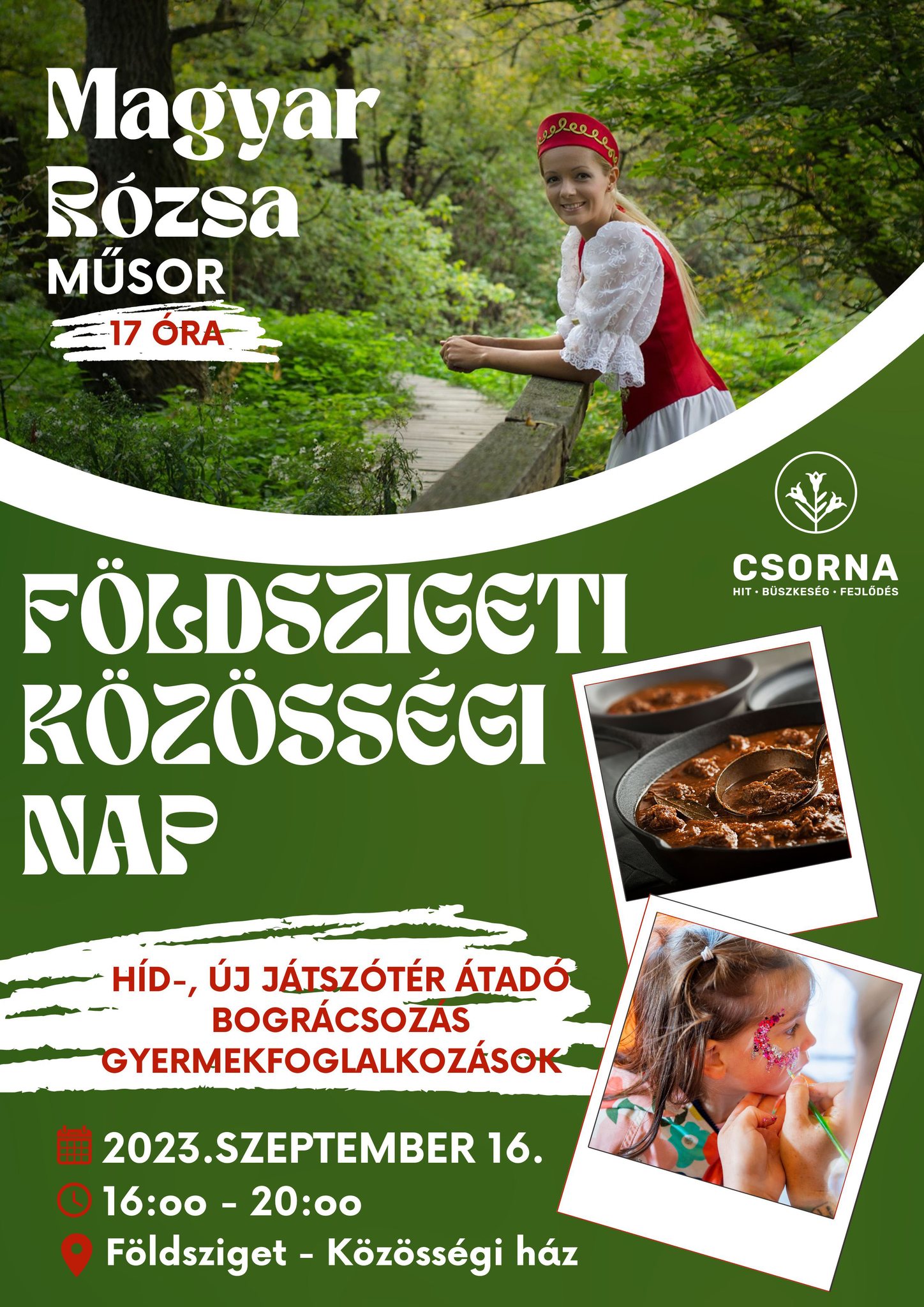Csorna Város képviselő-testülete szeretettel hívja a földszigetieket és minden érdeklődőt a közösségi napra. Az eseményen fellép Magyar Rózsa, valamint átadásra kerülnek a megvalósult földszigeti fejlesztések.