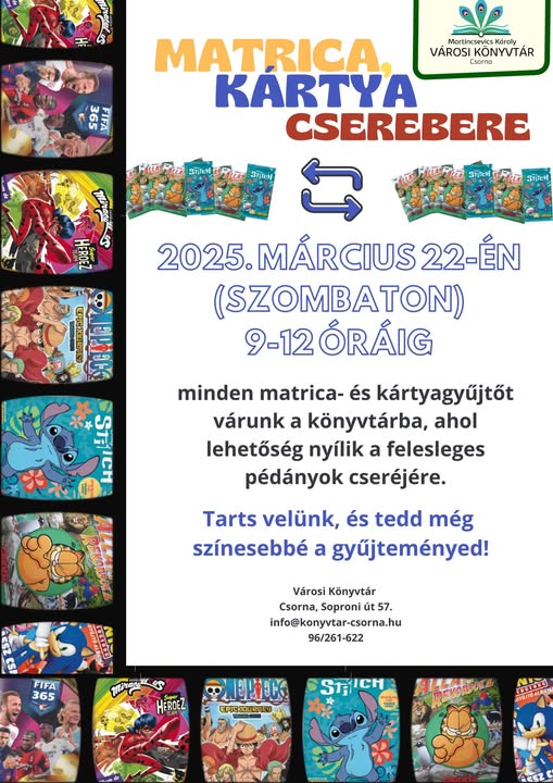 Március 22-én, szombaton 9:00 és 12:00 óra között a Városi Könyvtár ad otthont egy izgalmas matricás és kártyás találkozónak, ahol a résztvevők lehetőséget kapnak arra, hogy felesleges darabjaikat másokkal elcseréljék.