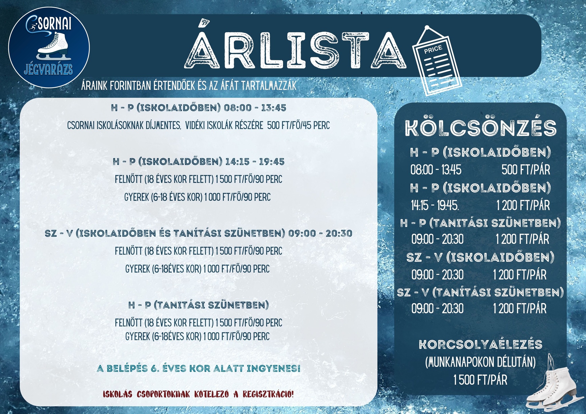 A már magabiztos korizóktól sem veszik el ezekben az időszakokban az idő. A pálya egy részét az oktatások ideje alatt is használatra bocsátják közönség korcsolyázásra!