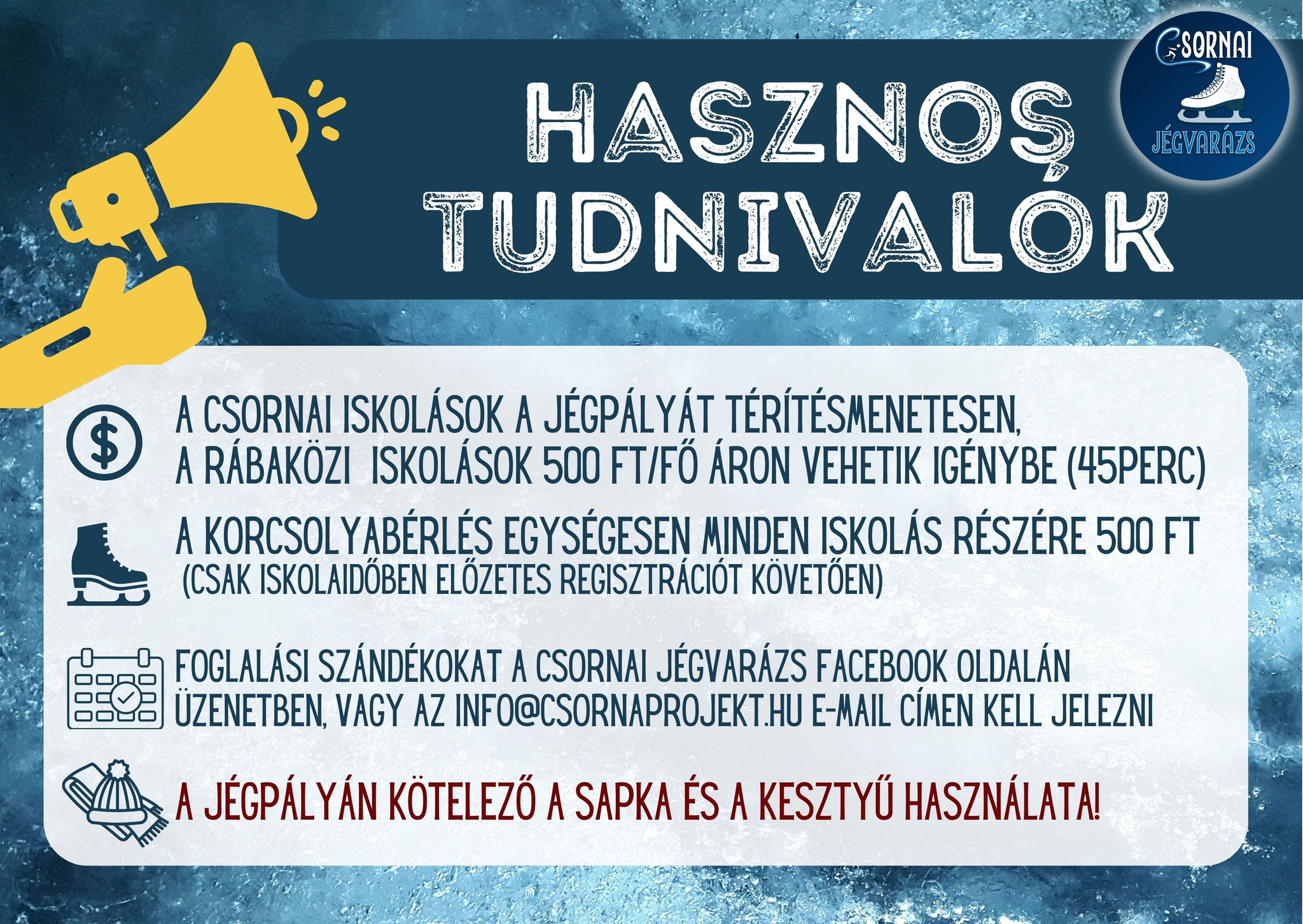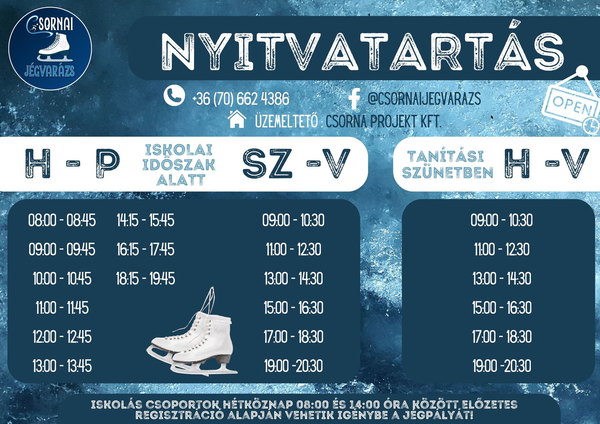2023. 12. 04. napjától tudják fogadni az iskolásokat. A leadott foglalásokat a Csorna Projekt Kft. munkatársai hétköznapokon 8:oo és 16:oo óra között fogják visszaigazolni, így a biztos időpont érdekében nem érdemes az utolsó pillanatra hagyni a jelentkezést. A jégpályán egyidejűleg maximum 200 fő tartózkodhat, a csoportokat foglalási sorrendben rögzítik!